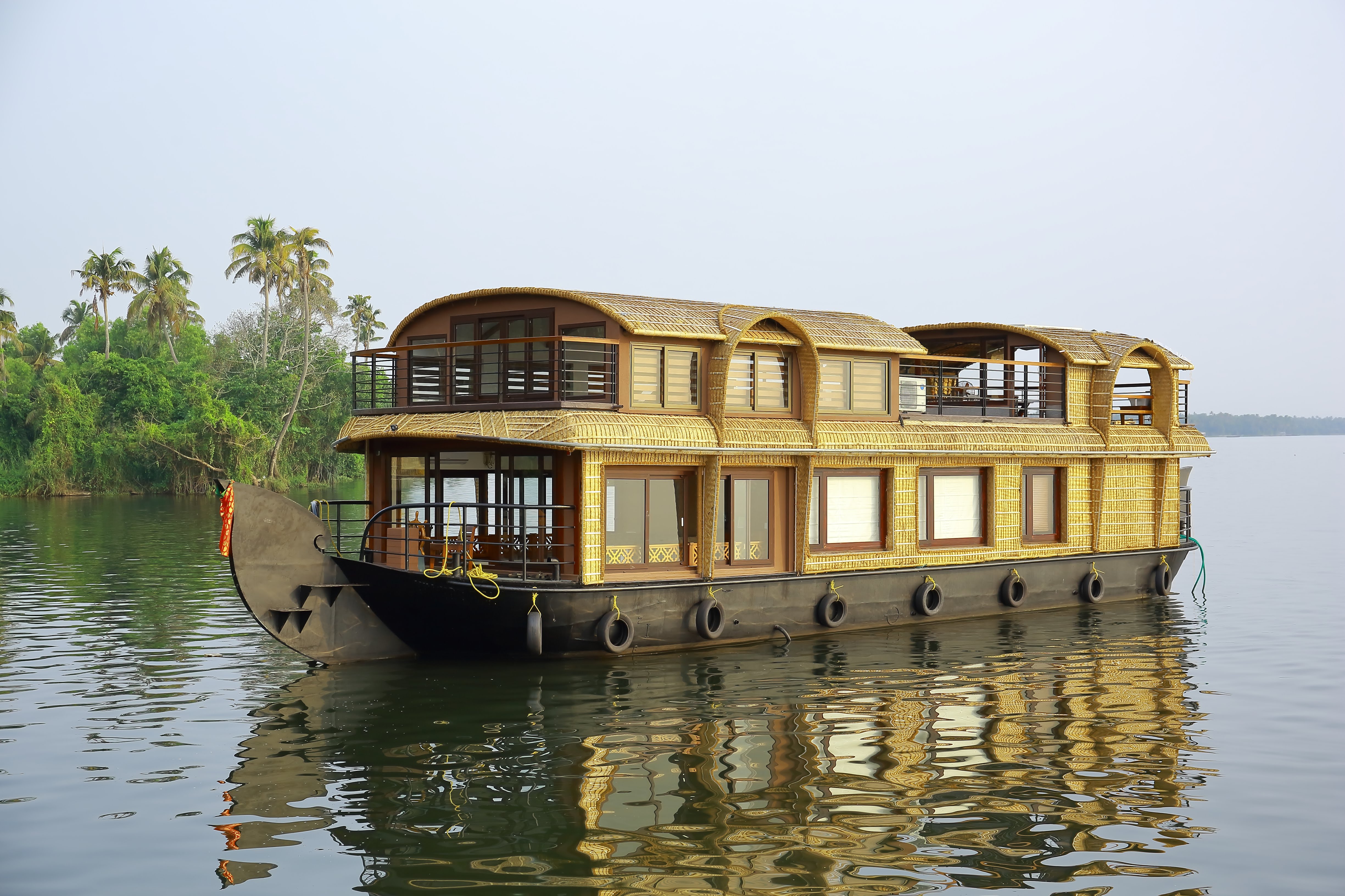 The houseboat boasts a private balcony that offers breathtaking views of the serene backwaters.